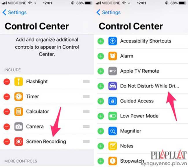 Để kích hoạt, đầu tiên bạn hãy truy cập vào Settings (cài đặt) > Control Center (trung tâm kiểm soát) > Screen Recording để thêm chức năng quay phim màn hình vào Control Center.