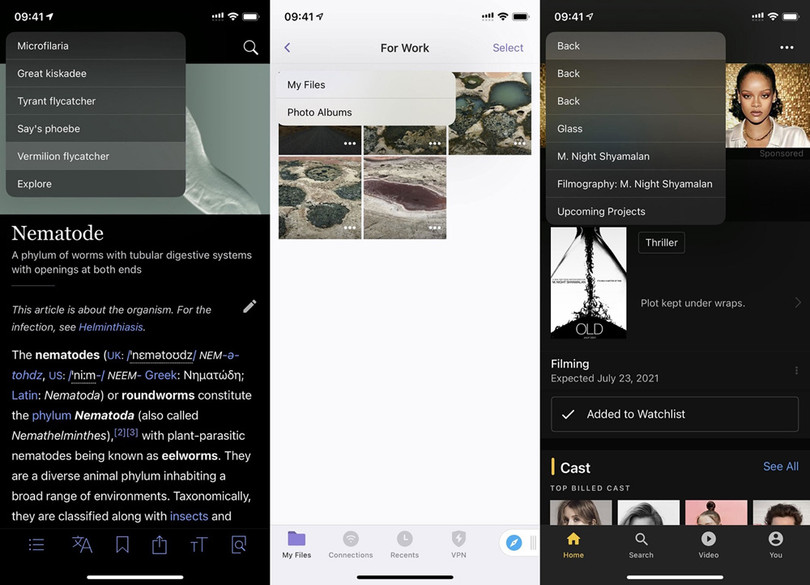 Cử chỉ nhấn giữ nút Back và trượt để kích hoạt trình đơn lịch sử vị trí khả dụng với rất nhiều ứng dụng của Apple bao gồm App Store, Books, Calendar, Clock, Contacts, FaceTime, Files, Keynote, Mail, Music, News, Notes, Numbers, Pages, Phone, Photos, Podcasts, và Safari.