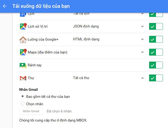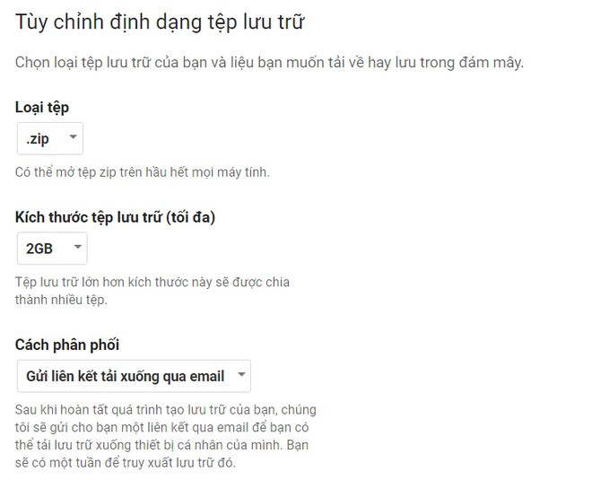 Cuối cùng bạn click chọn Create archive (Tạo tệp lưu trữ). Hãy ghi nhớ click chọn mục Mail để sao lưu toàn bộ dữ liệu email khi tải xuống tệp nén. Bạn có thể lựa chọn loại tệp, kích thước tệp lưu trữ tối đa (từ 1GB – 50GB) và cách tải về file sao lưu dữ liệu (gửi liên kết tải về qua email, thêm vào Drive, Dropbox và OneDrive).