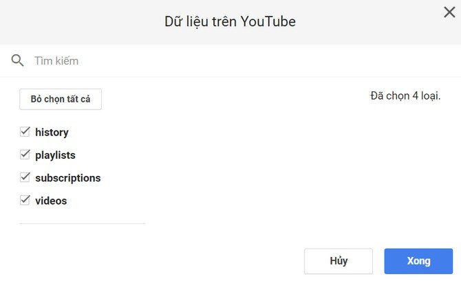 Lựa chọn các dữ liệu trên YouTube có thể sao lưu