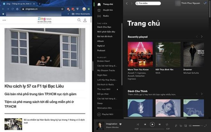 Tương tự iPadOS, macOS cũng có tính năng Split View cho phép chạy song song 2 ứng dụng trên một màn hình. Với phiên bản macOS Catalina, rê chuột vào nút màu xanh lá ở phía trên góc trái cửa sổ ứng dụng. Một hộp thoại hiện ra, chọn Tile Window to Left/Right of Screen để chuyển ứng dụng sang nửa trái/phải màn hình, sau đó chọn ứng dụng để chạy ở nửa còn lại. Trên các phiên bản cũ hơn, nhấn giữ nút tròn xanh lá trên góc rồi kéo cửa sổ sang trái hoặc phải để xếp vào vị trí tương ứng. Lưu ý tính năng chỉ xuất hiện từ OS X El Capitan trở lên. Để thoát Split View, rê chuột lên trên màn hình, nhấn nút xanh lá ở một trong 2 cửa sổ đang mở. Ảnh: Chụp màn hình.