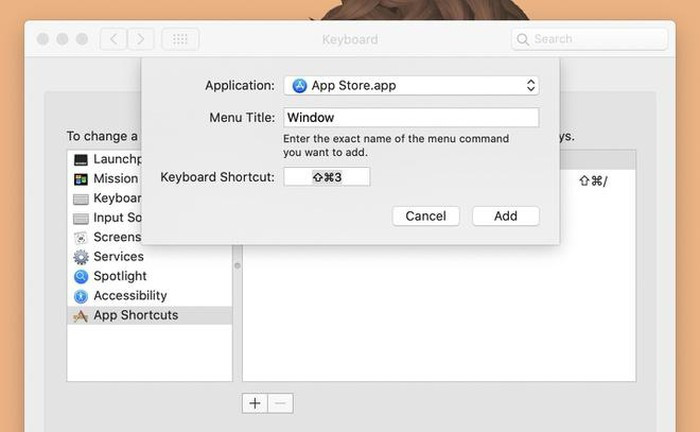 Bạn có thể cài đặt phím tắt nhanh để kích hoạt bất cứ menu trong ứng dụng ưa thích bằng cách mở System Preferences > Keyboard > Shortcuts > App Shortcuts > chọn dấu + rồi làm theo hướng dẫn. Ảnh: Chụp màn hình.