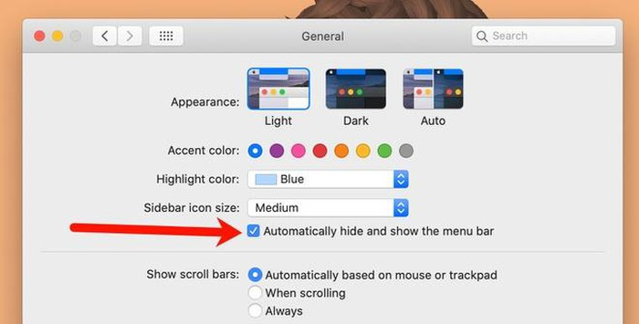 Nếu cần không gian hiển thị tối ưu, bạn có thể ẩn thanh công cụ ở phía trên màn hình bằng cách vào System Preferences -> General -> Automatically hide and show the menu bar. Ảnh: Chụp màn hình.