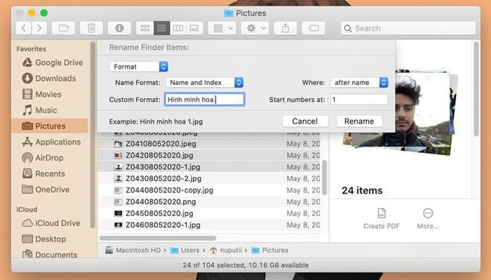 Thay vì mất thời gian đổi tên từng file, macOS có sẵn công cụ cho phép đổi tên hàng loạt file cùng lúc. Trong Finder, nhấn giữ phím Command rồi chọn các file muốn đổi tên, sau đó nhấn chuột phải rồi chọn Rename. Trong hộp thoại hiện ra, bạn có thể thêm chữ theo quy tắc, đánh số, thêm ngày tháng hoặc thay thế nội dung trong tên cho các file đã chọn. Ảnh: Chụp màn hình.