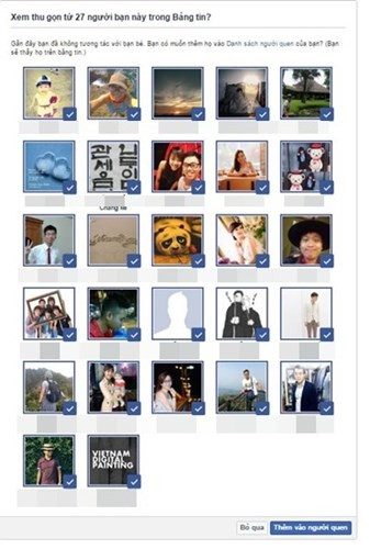 Đầu tiên người dùng truy cập vào địa chỉ https://www.facebook.com/friends/organize. Đây là chức năng lọc những liên hệ ít tương tác nhưng có điểm chung là cùng khu vực, nơi làm việc, học cùng trường, tần suất tương tác để phân loại. Với những người muốn tiếp tục giữ liên lạc, người dùng chỉ cần chọn ảnh đại diện của họ và thêm vào danh sách người quen hiện ra phía dưới. Tại đây cũng có thể thấy những người không quen biết, người dùng có thể hủy kết bạn với họ để danh sách bạn bè “gọn gàng” hơn.
