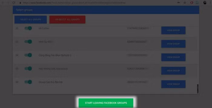Bước 3: Nhấn vào mục SELECT ALL GROUPS để chọn toàn bộ Group. Hoặc chọn từng Group mà bạn muốn thoát. Sau đó click chuột vào START LEAVING GROUP FACEBOOK.