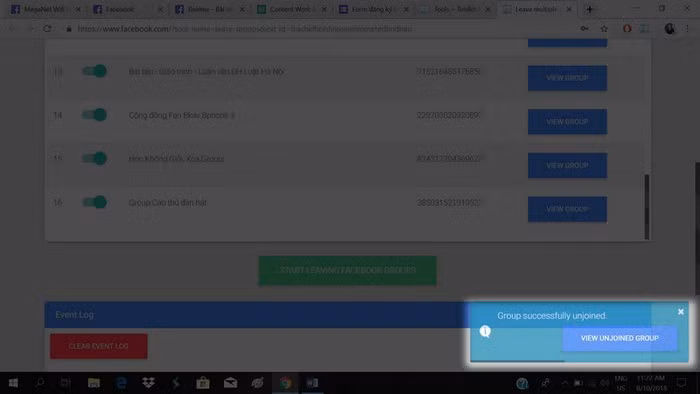 Bước 4: Bạn đợi để công cụ thực hiện trong giây lát tùy thuộc vào số group mà bạn muốn thoát là nhiều hay ít, trong tài khoản Facebook của mình có rất nhiều group mà mình muốn rời khỏi.