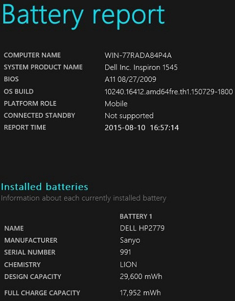 Cuối cùng, bạn có thể sử dụng lệnh " powercfg /batteryreport " để tạo bản phân tích trạng thái dùng pin gồm các thông tin như tỉ lệ sạch, số vòng đời và lịch sự dùng/sạc pin gần nhất. Những thông tin này khá hữu ích để bạn đánh giá, phân tích và phát hiện những dấu hiệu bất thường về pin.