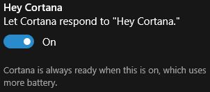Cortana là trợ lý cá nhân ảo trong Windows 10. Tính năng này nằm ngay trên thanh taskbar và luôn được bật tự động. Một số phàn nàn cho rằng Cortano có thể ngốn tới 6% ngay cả trong trạng thái chờ. Tuy nhiên, thử nghiệm thực tế cho thấy ở trạng thái chờ nó chỉ tiêu hao dưới 0,3% pin. Pin chỉ tiêu hao hơn khi lệnh thoại "Hey Cortana" được kích hoạt.