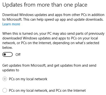 Chưa hết, Windows 10 có khi lại chia sẻ bản update vừa download về với các máy tính khác trong mạng cục bộ hoặc qua mạng Internet khiến cho pin tụt nhanh hơn, đồng thời khiến cho băng thông đường truyền bị nghẽn. Để tắt tính năng Windows Update Deliver Optimization, bạn vào phần Settings ( nhấn tổ hợp phím Windows + I) > Update & security > Windows Update > Advanced options > Choose how updates are delivered , vào phần " PCs on my local network " và tắt tính năng này đi.