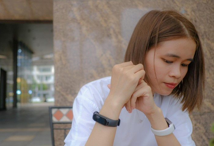 Mi Band 4 (phải) và Galaxy Fit (trái) là hai mẫu vòng đeo tay thông minh có thiết kế nhỏ gọn, thời trang. Tôi không thấy sự chênh lệch quá nhiều về kích thước khi đặt hai thiết bị cạnh nhau. Galaxy Fit có phần kim loại bao quanh mặt đồng hồ mang đến cảm giác cao cấp hơn so với Mi Band 4.