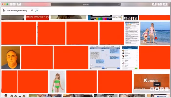 Với từ khóa không liên quan đến làm dụng trẻ em như "kids on omegle showing" (trẻ em trò chuyện với người lạ), Bing cho ra rất nhiều kết quả tìm kiếm hình ảnh ấu dâm. Ảnh: TechCrunch.