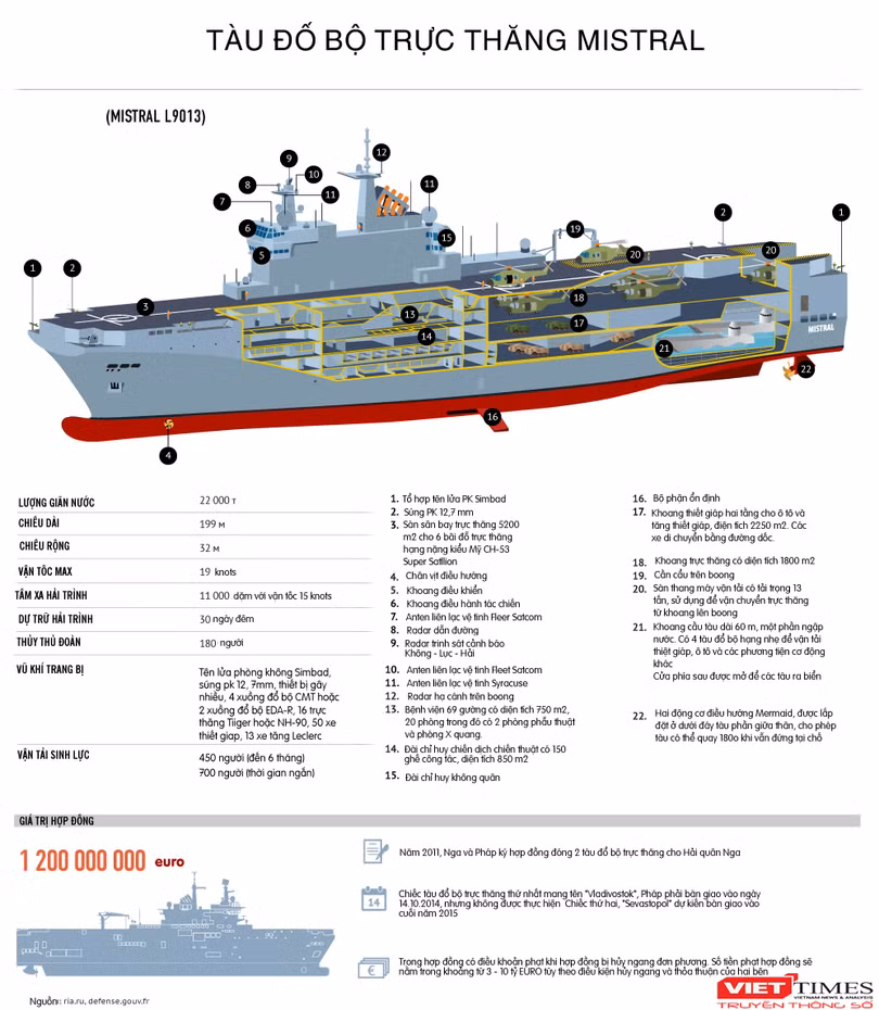 Điểm thú vị là Pháp tất nhiên sẽ trả lại tiền Nga, nhưng số phận 2 tàu Mistral thật khó dự đoán. Không phải là chiến hạm tác chiến thường xuyên như frigates hoặc destroys, được xây dựng theo quan điểm khai thác sử dụng của Nga, nếu Pháp có đủ khả năng bán cho một nước phương Tây nào đó, buộc phải làm lại theo chuẩn EU, nếu giữ lại trong hạm đội, thì đó là một gánh nặng khủng khiếp cho ngân sách mà Bộ quốc phòng phải chiến đấu thường xuyên và biết chắc chắn, nó sẽ không bao giờ có được một vị trí nào trong lực lượng hải quân Pháp.