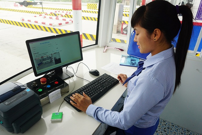 Nhân viên soát vé Nguyễn Thị Hoài đang thao tác quy trình kiểm soát phương tiện. Sau khi lưu thông qua trạm thu phí, lái xe sẽ trả tiền nhận thẻ và sẽ trả thẻ ở điểm thu phí cuối. Trạm thu phí này có cả làn thu tự động lẫn nhân viên trực tiếp phát thẻ thu tiền.