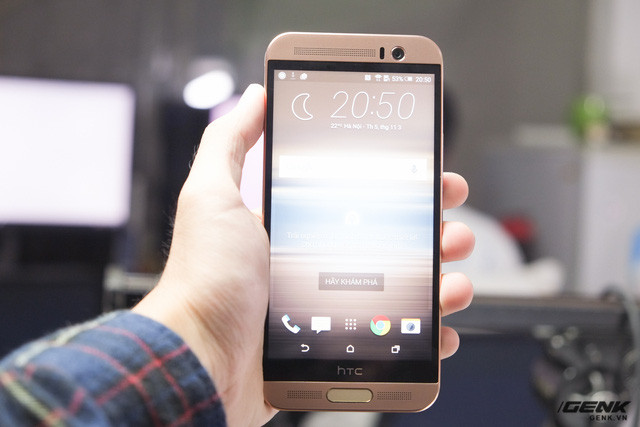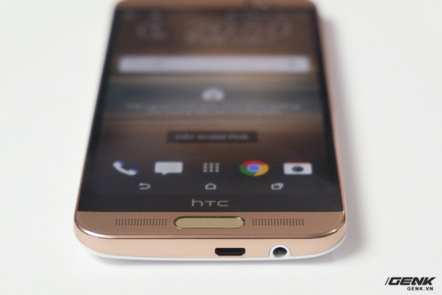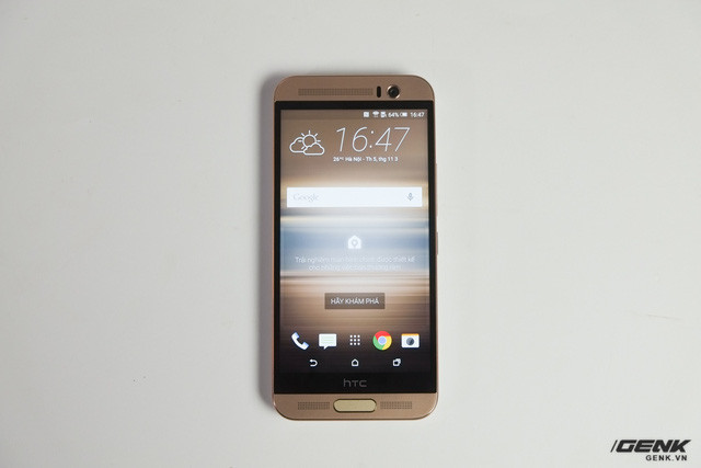 Đây là HTC One ME. Máy mang thiết kế quen thuộc của HTC với hệ thống loa BoomSound, dải đen lớn xung quanh màn hình và logo HTC