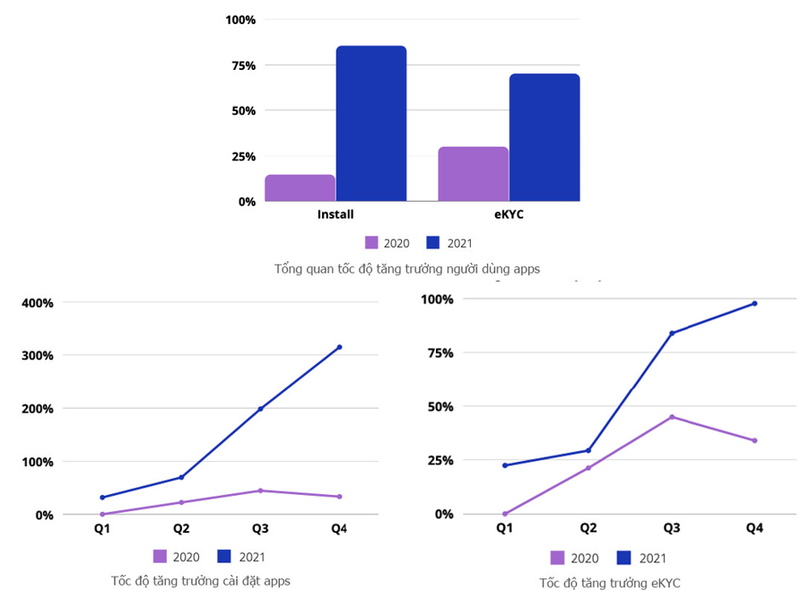 Cụ thể, trong năm 2021, lượt cài đặt apps ngân hàng đã tăng gấp 4,5 lần so với năm 2020 và ghi nhận mức tăng trưởng ấn tượng, từ 3-6 lần cùng kỳ mỗi quý. Cùng giai đoạn này, lượng eKYC cũng tăng trưởng gấp 2,5 lần.