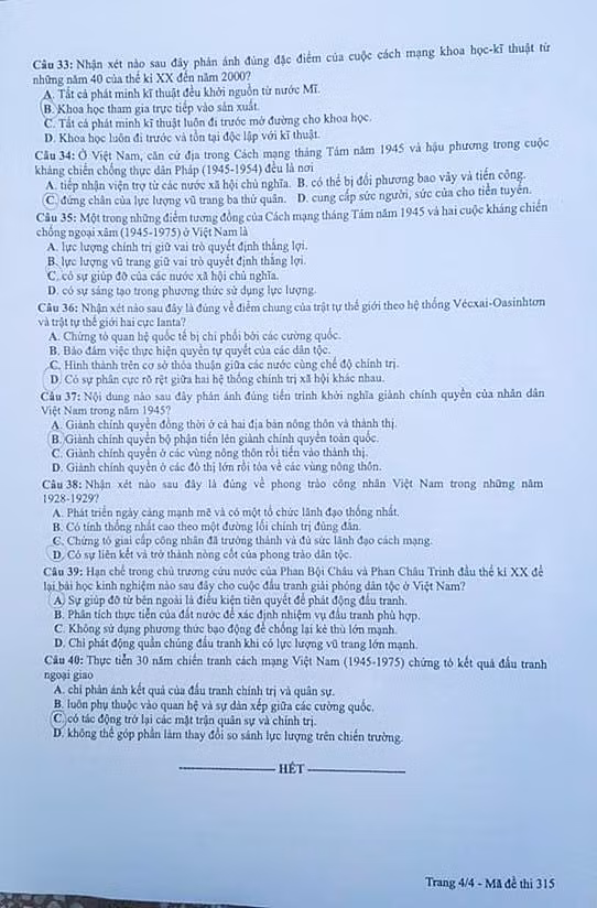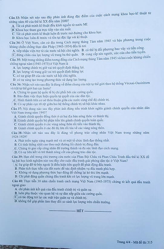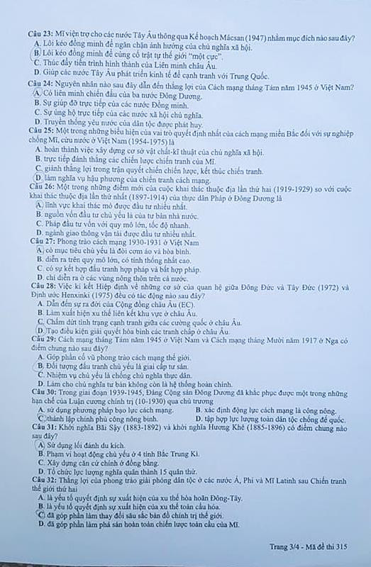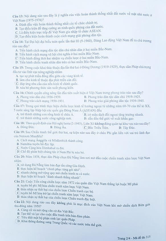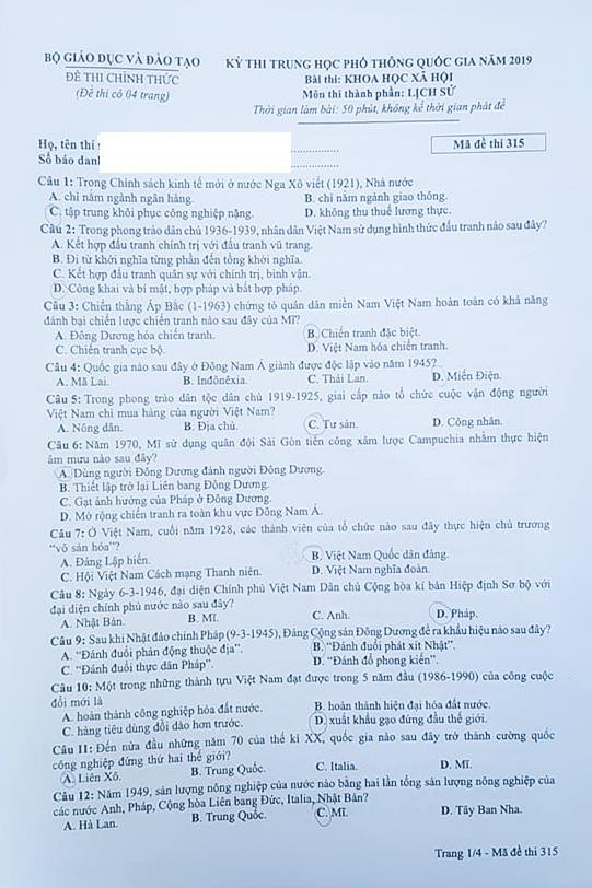 Đáp án môn Lịch sử kì thi THPT Quốc gia 2019 mã đề 315 theo gợi ý của tuyensinh247