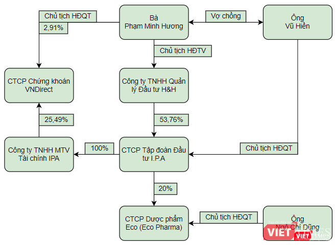 Nổi bật trong số đó có thể kể đến khoản đầu tư vào Công ty Chứng khoán VNDirect. Tại đây, Chủ tịch HĐQT IPA - ông Vũ Hiền - đang là Thành viên HĐQT, trong khi phu nhân của ông - bà Phạm Minh Hương - giữ cương vị Chủ tịch HĐQT. Bà Hương cũng là Chủ tịch HĐTV của Công ty TNHH Quản lý đầu tư H&H - công ty mẹ IPA.