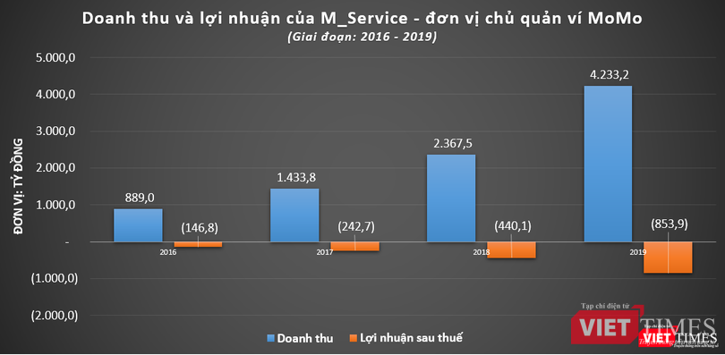 Dữ liệu của VietTimes cho thấy, song song với sự tăng trưởng số lượng người dùng MoMo, doanh thu của M_Service trong giai đoạn 2016 – 2019 cũng có sự tăng trưởng đáng nể. Riêng trong năm 2019, doanh thu của M_Service đạt mức 4.233,2 tỷ đồng, cao gấp 4,7 lần năm 2016.