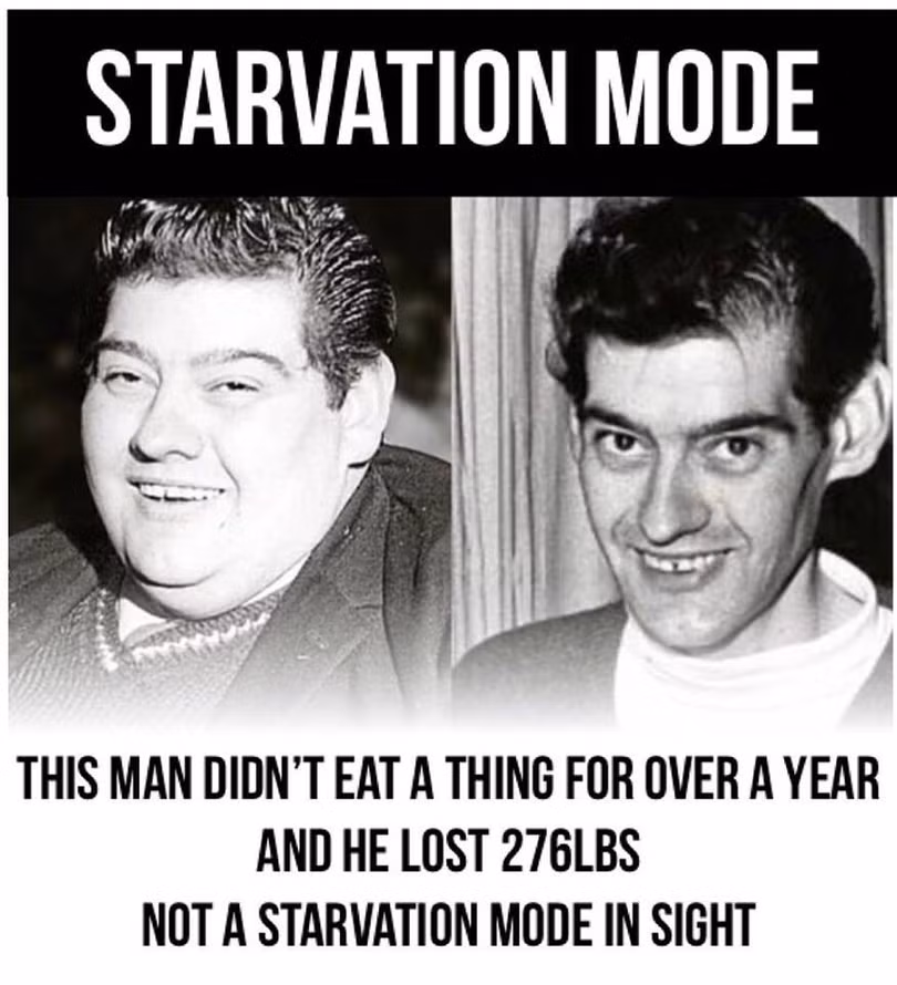 Tạp chí Postgraduate Medical xuất bản năm 1973 có ghi lại một trường hợp khó tin về một người đàn ông Scotland 27 tuổi béo phì đã nhịn ăn tổng cộng 382 ngày trong nỗ lực tuyệt vời để giảm cân. Mặc dù không ăn nhưng anh vẫn có sức khỏe tốt và đã giảm được từ 206 kg xuống còn 81 kg. Theo các bác sỹ tại Đại học Y khoa Dundee, 5 năm sau khi trải qua giai đoạn giảm cân nói trên, cân nặng của người đàn ông này ổn định ở mức 88 kg.