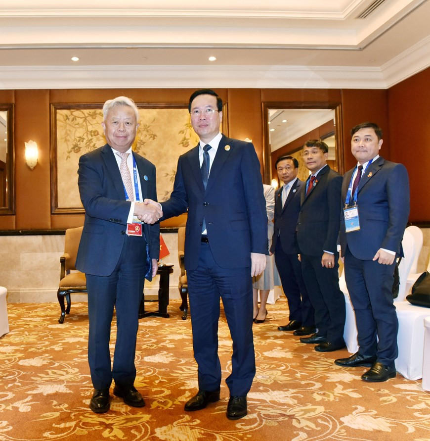 Chủ tịch nước Võ Văn Thưởng gặp Chủ tịch Ngân hàng Đầu tư Cơ sở Hạ tầng châu Á (AIIB) Kim Lập Quần. (Ảnh: Tiến Trung/TTXVN)