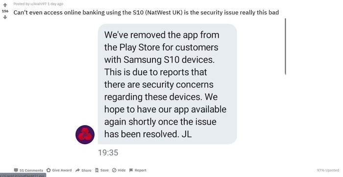 Ngân hàng NatWest (Anh) phản hồi về việc gỡ ứng dụng trên Play Store. Ảnh: Reddit