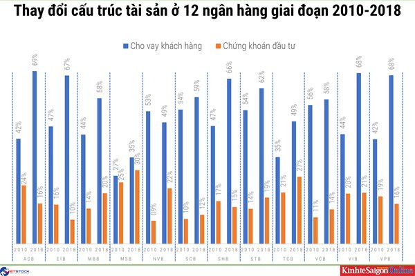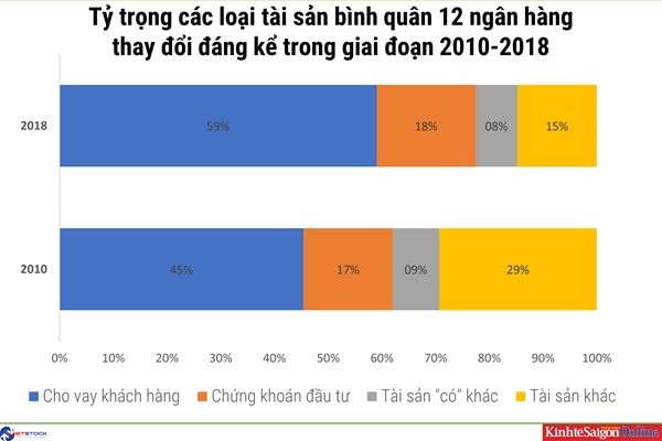 Khảo sát của TBKTSG Online dựa trên số liệu của Vietstock, cũng cho thấy cấu trúc tài sản của nhiều nhà băng đã thay đổi đáng kể trong khoảng 10 năm qua.
