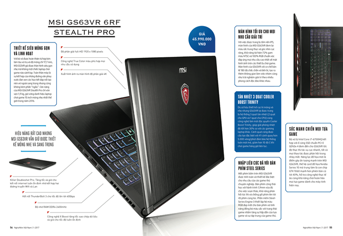 Với thiết kế siêu mỏng được bảo vệ bởi bộ vỏ bằng hợp kim hàng không, MSI Stealth Pro giữ được thân hình gọn nhẹ nhưng bền chắc. Đáng chú ý là sức mạnh bên trong của MSI GS63VR khiến cho nhiều đối thủ phải thèm muốn bởi khả năng chiến mọi tựa game đồ họa nặng với tốc độ xử lý vượt trội và trang bị hàng loạt công nghệ cao cấp. MSI GS63VR là lựa chọn lý tưởng cho game thủ thích một chiếc laptop đáp ứng cả ba tiêu chí: mỏng, mạnh và mát.