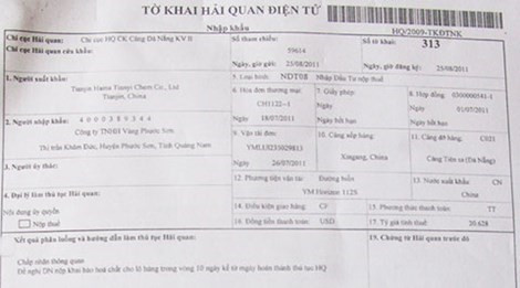 Tờ khai hải quan của Công ty Besra để nhập khẩu Cyanua. Ảnh: TẤN TÀI