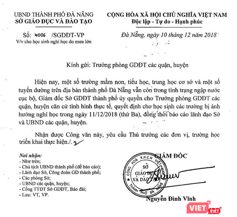 Cập nhật mới hơn, cuối giờ chiều hôm nay (10/12), Giám đốc Sở Giáo dục và Đào tạo Đà Nẵng Nguyễn Đình Vĩnh cũng đã ký văn bản gửi Trưởng phòng GD&ĐT các quận huyện trên địa bàn thành phố, ủy quyền cho các Trưởng phòng căn cứ tình hình thực tế, quyết định cho học sinh các trường bị ảnh hưởng nghỉ học vào ngày mai Thứ Ba (ngày 11/12/2018).