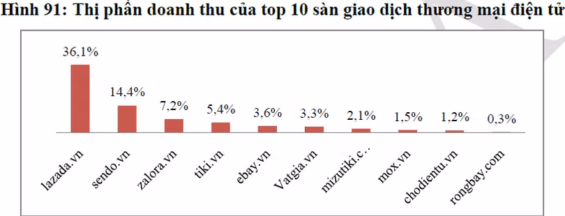 Đặc biệt, áp đảo doanh thu thị trường TMĐT thuộc về sàn Lazada.vn vốn đầu tư của Rocket Internet (Đức) tại Việt Nam. Theo báo cáo, doanh thu của Lazada chiếm 36,1% tổng doanh thu, bỏ qua các đối thủ tên tuổi như ebay, vatgia hay chodientu… có mặt tại Việt Nam.