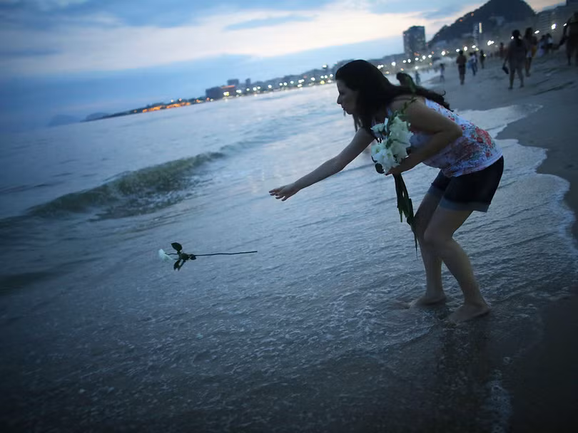Người Brazil ném những bông hoa trắng xuống biển vào đêm giao thừa như một món quà cho Nữ thần Biển.