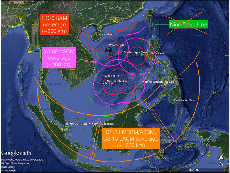 Những các vòng tròn phạm vi tấn công hiệu quả của các loại tên lửa khác nhau cho thấy, trong tình huống đối phó với một cuộc tấn công tiềm năng, Trung Quốc sẽ có chiếc ô lá chắn lồng vào nhau và cùng có sự yểm trợ lẫn nhau. hệ thống tên lửa phòng không SAM, bố trí trên các đảo có thể bao trùm hầu hết quần đảo Trường Sa và các tổ hợp tên lửa ASCM khống chế một khu vực rộng lớn ở trung tâm Biển Đông, bao trùm cả lên nhiều vùng lãnh thổ rộng lớn của các quốc gia láng giềng.