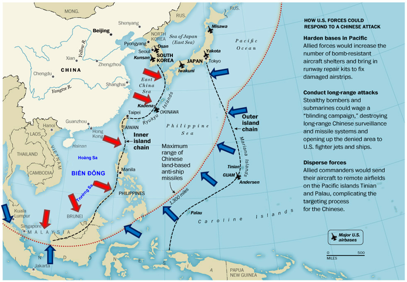 Trung Quốc sau đó sẽ sử dụng lại chiến lược chiến tranh thế giới II của Nhật Bản trong việc thiết lập một vành đai phòng thủ hải quân dọc theo toàn bộ vùng nước phía tây Thái Bình Dương. Mỹ buộc phải tổ chức lại các tuyến đường vận tải tiếp vận và sử dụng các phương tiện tác chiến tầm xa để tấn công Trung Quốc.