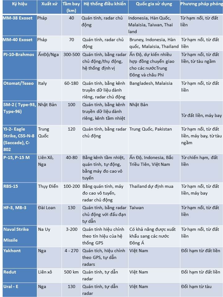 Hiện nay trong khu vực biển Đông và biển Hoa Đông có đến 45 loại tên lửa chống tàu khác nhau, có trong trang bị của quân đội các nước như Indonesia, Malaisia, Việt Nam, Bruney và tất nhiên là cả Trung Quốc. Tính năng kỹ-chiến thuật của những loại phổ biến nhất trong số đó và dự kiến đưa vào trang bị được giới thiệu trong bảng dưới đây.