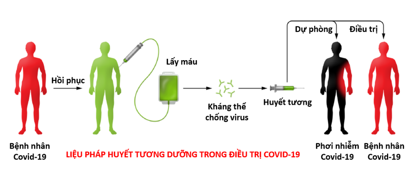 Từ đây, ý tưởng của việc “lấy” một phần huyết tương người đã hồi phục có chứa kháng thể để điều trị cho người bệnh hoặc dự phòng cho người mới phơi nhiễm bệnh được ra đời. Có thể tóm tắt ý tưởng này trong hình sau đây:
