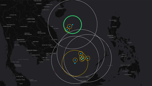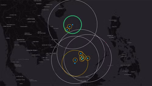 Các vòng tròn thể hiện năng lực chống tiếp cận bằng radar, tên lửa, chiến đấu cơ của Trung Quốc trên Biển Đông. Đồ họa: CSIS