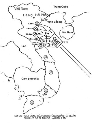 Như ở trong chiến tranh Triều Tiên, Cụm không quân hải quân tác chiến số 77 (ACTF -77) luân phiên có 15 tàu sân bay tác chiến chủ lực và 2 tàu sân bay chống ngầm, trong xuốt cuộc chiến đã tiến hành 66 chiến dịch tập kích bở biển Việt Nam trên quy mô lớn.