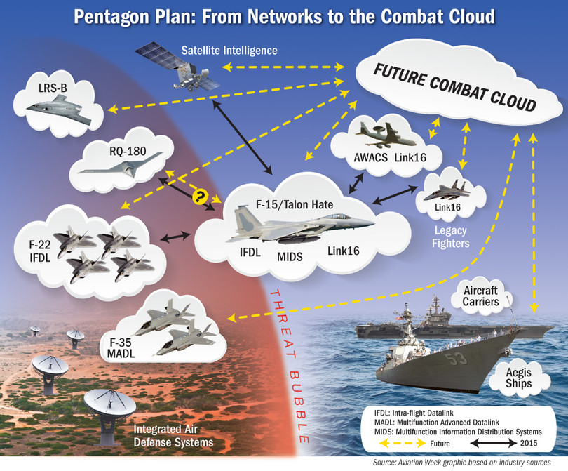 Tiêm kích tàng hình thế hệ thứ 5 F-22 được trang bị hệ thống trang thiết bị công nghệ thông tin hiện đại, có khả năng kết nối vào mạng thông tin chiến thuật data link, nhưng liên kết phối hợp với tiêm kích hạng nặng F-15 trong một hệ thống tác chiến chiến thuật dạng mạng NET thì không thể, do F-15 là máy bay được sản xuất từ năm 1972, hệ thống trang thiết bị điện tử trên thân được coi là đã lỗi thời so với các máy bay thế hệ 4++ và thế hệ 5. Nhưng Lầu Năm Góc dự kiến sẽ kéo dài thời gian phục vụ của F-15 thêm vài thập kỷ nữa.