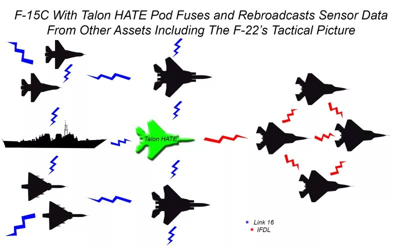 Trong khuôn khổ chương trình Talon HATE, máy bay tiêm kích F-15 nâng cấp được lắp đặt hệ thống cảm biến mới, máy tính trên thân và một phần mềm cho phép truyền tải thông tin từ F-15 đến các loại phương tiện quân sự khác, bao gồm cả máy bay chiến đấu các loại và các trạm trinh sát, các trung tâm chỉ huy mặt đất. Tổ hợp này được lắp đặt trong một thùng container treo, được coi là thành phần cấu thành của hệ thống Talon HATE.