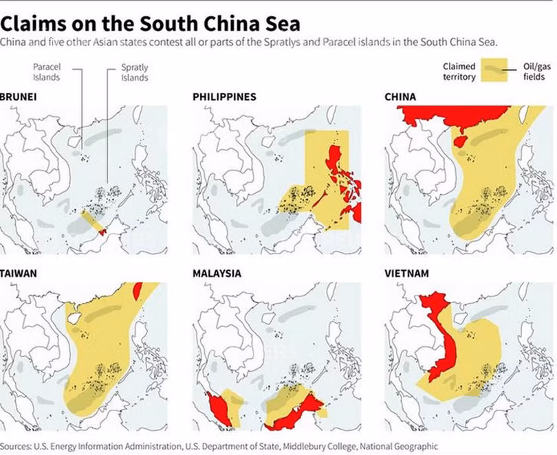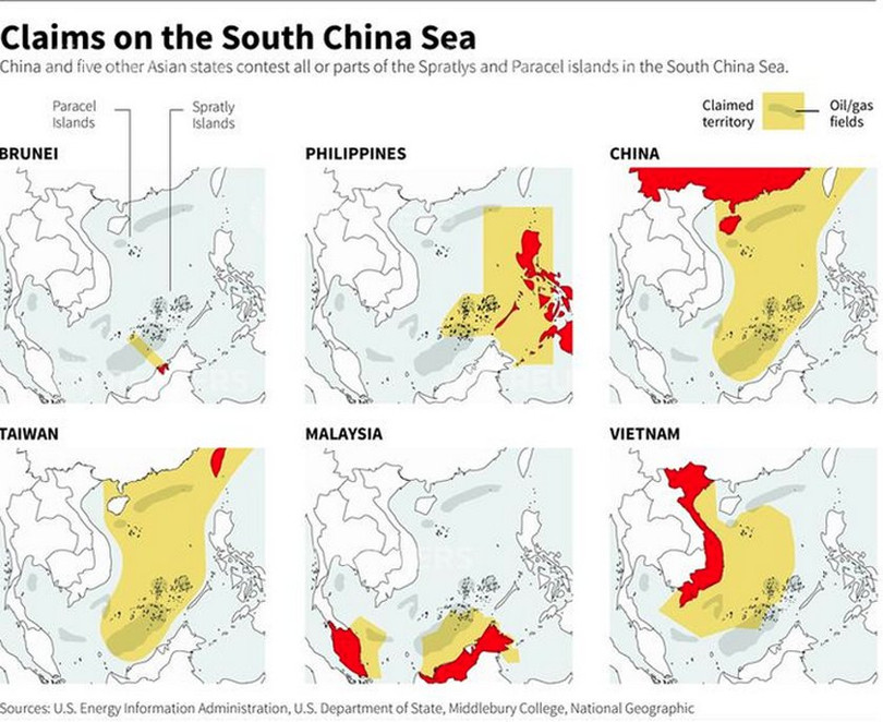 Bản đồ phân vùng khu vực tuyên bố chủ quyền của các nước có tranh chấp trên Biển Đông theo Reuters, trong đó thể hiện rõ tham vọng của Trung Quốc và Đài Loan, không dựa trên bất cừ căn cứ nào