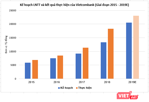 Nhìn lại giai đoạn từ năm 2015 - 2018, Vietcombank đã nhiều lần hoàn thành vượt mức chỉ tiêu kế hoạch kinh doanh về LNTT.