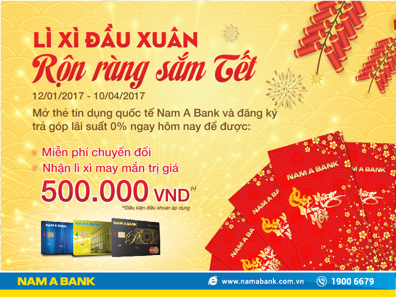Bên cạnh đó, với chương trình “Lì xì đầu xuân - Rộn ràng sắm Tết”, khách hàng mở mới hoặc đã sở hữu thẻ tín dụng quốc tế Nam A Bank, khi đăng ký trả góp lãi suất 0% tại các đại lý không liên kết với kỳ hạn 03 tháng, sẽ được miễn 100% phí chuyển đổi. Hấp dẫn hơn, 150 khách hàng đầu tiên mở thẻ và đăng ký trả góp lãi suất 0% còn có cơ hội được lì xì ngay 500.000 VNĐ. Chương trình được triển khai đến hết 10/04/2017.