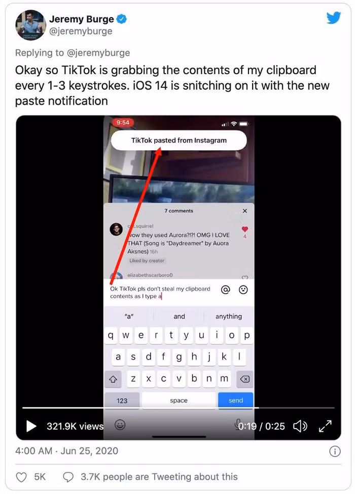 Đây không phải vấn đề lớn với các phiên bản iOS trước. Tuy nhiên, iOS 14 lại hiện lên tất cả những lần ứng dụng đọc clipboard, và điều khiến người dùng ngạc nhiên là nhiều ứng dụng đọc dữ liệu clipboard liên tục. Mọi chuyện dần ồn ào từ ngày 25/6, khi một tài khoản trên Twitter đăng tải đoạn video ghi lại hàng loạt thông báo về ứng dụng chia sẻ video trực tuyến TikTok đang truy cập và đọc clipboard.