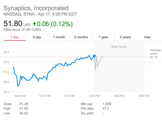 Synaptics được định giá thị trường vào khoảng 1,86 tỷ USD và cổ phiếu ít biến động trước thời điểm xuất hiện báo cáo từ Credit Suisse. Hiện công ty chưa đưa ra lời bình luận nào.