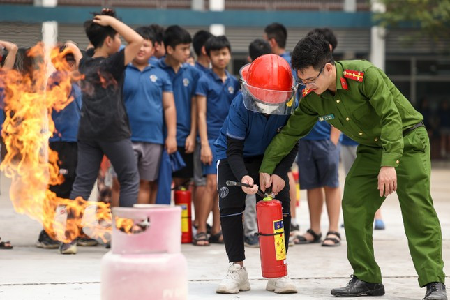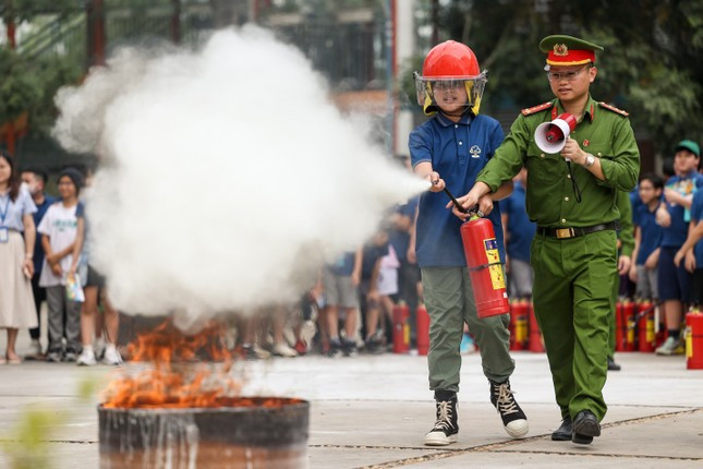 “Không dùng nước chữa cháy nếu khu vực xảy ra cháy chưa được ngắt điện để tránh điện giật, nguy hiểm cho người tham gia chữa cháy. Đối với những đám cháy xăng dầu thì có thể sử dụng các chất chữa cháy như cát, chăn chữa cháy, bọt chữa cháy,.... Trong phòng kín, nếu có cháy, khói có xu hướng lan, bay lên trần nhà, vậy nên các em cố gắng cúi người, bò sát mặt đất càng tốt, đồng thời sử dụng khăn ẩm ướt che miệng, mũi để bảo vệ cơ quan hô hấp. Hiện nay, nhiều gia đình ở chung cư, nhà cao tầng, khi cháy xảy ra thì các em sử dụng các lối thoát nạn là các lối trực tiếp thoát ra bên ngoài như cầu thang bộ, hoặc chạy ra ban công… Phòng cháy hơn chữa cháy, các em cũng lưu ý, không nghịch lửa, chú ý an toàn khi sử dụng điện trong gia đình”, Đại úy Đạt truyền đạt một số kiến thức chữa cháy tới các em học sinh.
