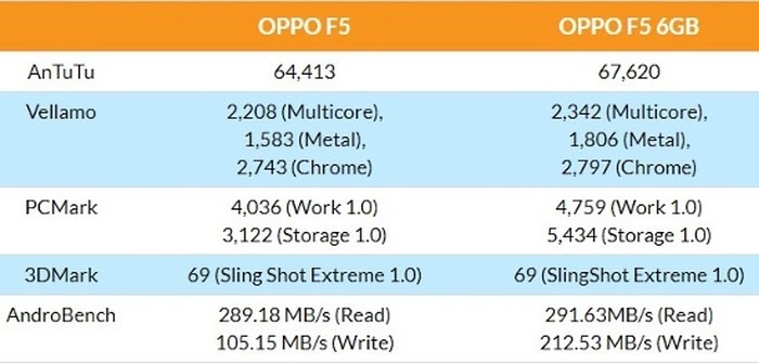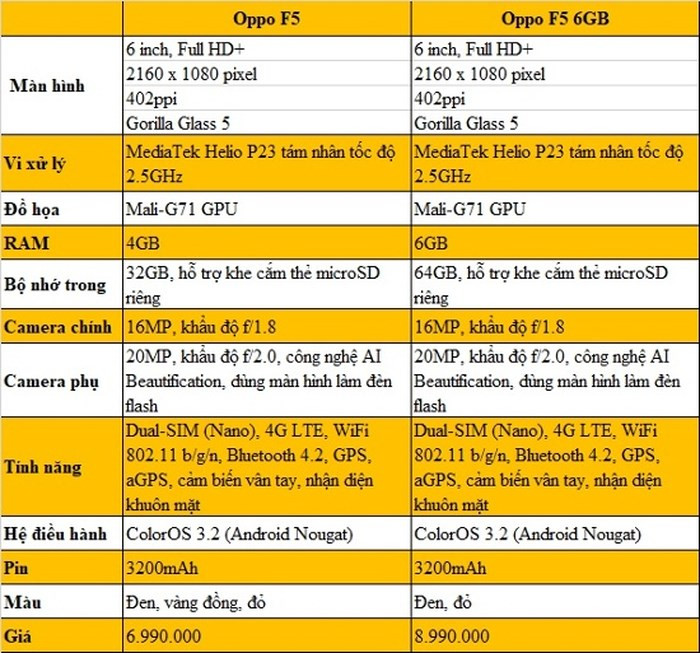 Bảng so sánh cấu hình giữa Oppo F5 và Oppo F5 6GB