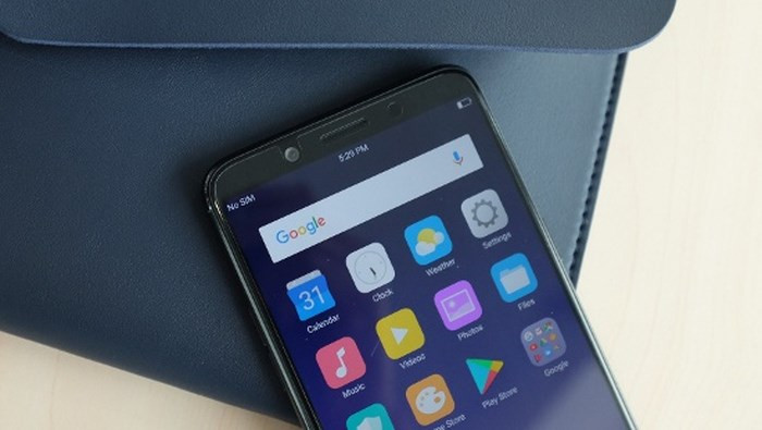 Mặt trước của Oppo F5 nổi bật với màn hình chiếm phần lớn diện tích, nhất là bản màu đen do viền mỏng tiệm với màu màn hình, nên tạo cảm giác không viền. Ngoài ra do thiết kế theo xu hướng tỷ lệ mới 18:9 nên dù có màn hình 6 inch nhưng kích thước chỉ cỡ máy 5.5 inch, vì vậy vẫn dễ dàng cầm và sử dụng bằng một tay.