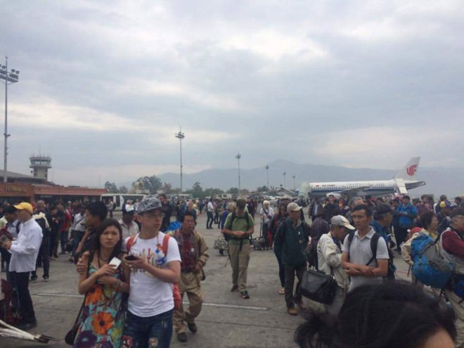 Động đất còn gây tuyết lở trên đỉnh núi Everest, chôn vùi một phần trại của những người leo núi. Ít nhất 8 người đã thiệt mạng, trong đó có du khách nước ngoài. Trong ảnh là quang cảnh hỗn loạn ở sân bay quốc tế Tribhuvan, Kathmandu. Ảnh: Reuters