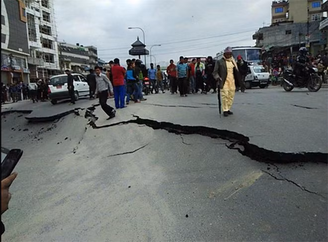 Cường độ của nó làm các mặt đường bị nứt thành những rãnh lớn và sập xuống khi người dân hoảng hốt chạy ra khỏi nhà. Ảnh: Times of India